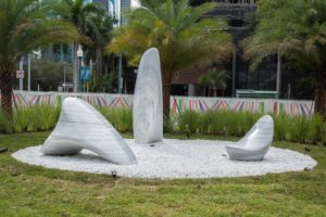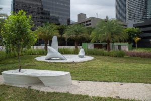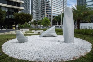El proyecto nombrado como “Speedforms in the Garden” consiste en la adecuación de un jardín exterior situado en el 770 de Brickell Avenue, donde 3 imponentes monolitos de mármol Blanco Macael elaborados por Cuellar Stone presiden el espacio. Cada una de estas piezas de piedra natural representa un tipo de elemento el cuál Pininfarina suele diseñar (coches, barcos, y edificios), y varían en tamaños y pesos que van desde los 600kg hasta casi los 2000kg. Los monolitos están acompañados por unos bancos, una barra y un suelo de 200 metros cuadrados, elaborados en Dekton por la firma Cosentino. Además, este espacio cuenta con una jardinería realizada por el Studio Mavignier – Landscape, y una iluminación de la empresa americana The Lighting Studio. Todo este desarrollo fue posible gracias al gran trabajo llevado a cabo en tiempo récord por la constructora local Pedreiras Inc.