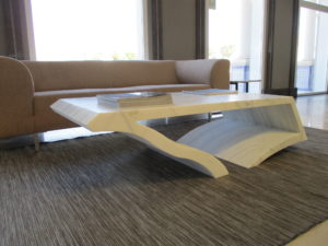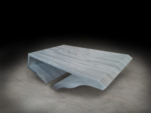 El resultado de la interpretación de la vitalidad propia de un bloque de mármol, fue este modelo de mesa de centro, en Mármol Blanco Macael, caracterizado por su fondo albo y suave veteado gris.